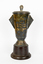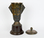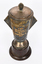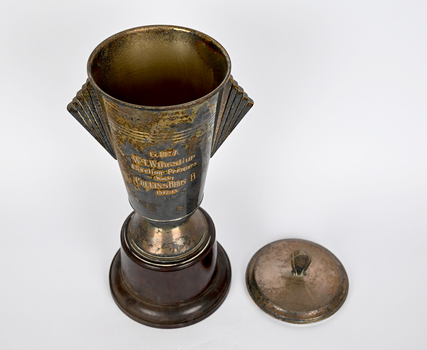 Metal trophy on bakelite base, with lid. Tall, round shaped cup, with solid triangular shaped attachments used as handles, one on either side. Lid is flat and with triangular shaped handle. Trophy is engraved on front.