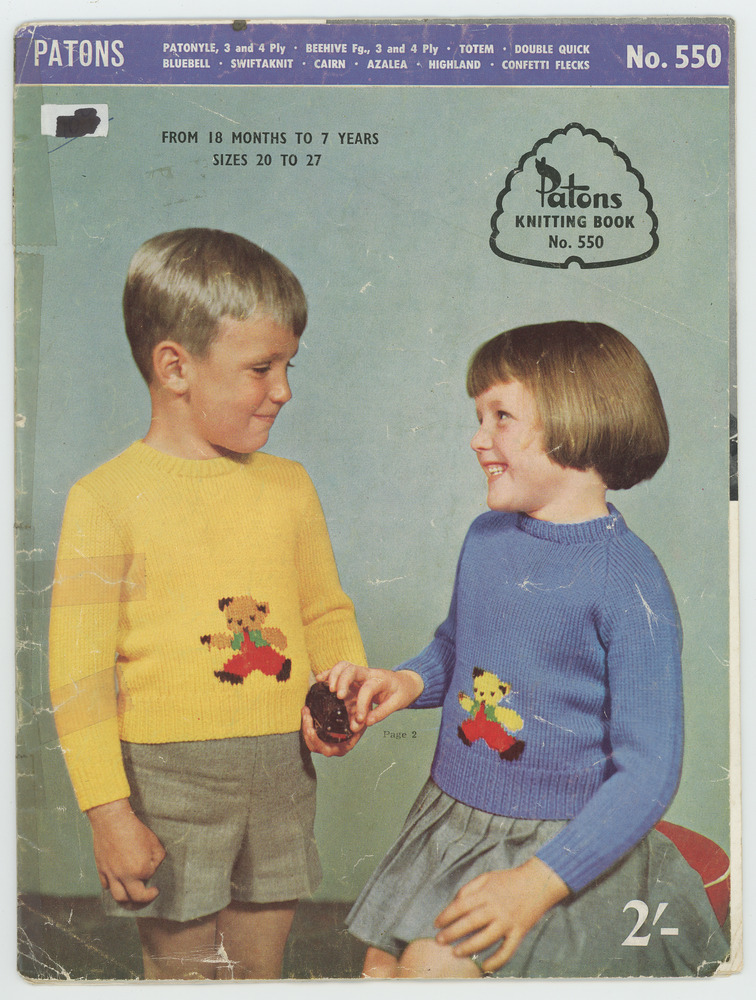 PATONS / PATONYLE, 3 and 4 Ply . BEEHIVE Fg., 3 and 4 Ply . TOTEM . DOUBLE QUICK / BLUEBELL . SWIFTAKNIT . CAIRN . AZALEA . HIGHLAND . CONFETTI FLECKS / No. 550 / FROM 18 MONTHS TO 7 YEARS / SIZES 20 TO 27 / Patons / KNITTING BOOK / No. 550 / 2'-