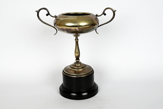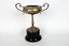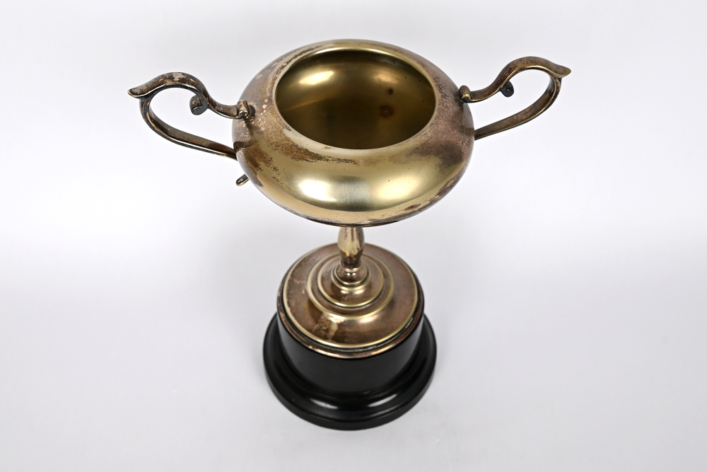 Cup mounted on bakelite base. Round bowl with two side handles. One side handle has been re-welded at a slightly different angle. Bowl sits on a slender curved stem. The base is round with a leather base.