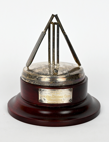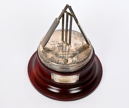 Cup has two cricket bats leaning against three cricket stumps with a cricket ball in the foreground. This is set on a circular, wooden, red lacquered base. Silver plaque on side with inscription.