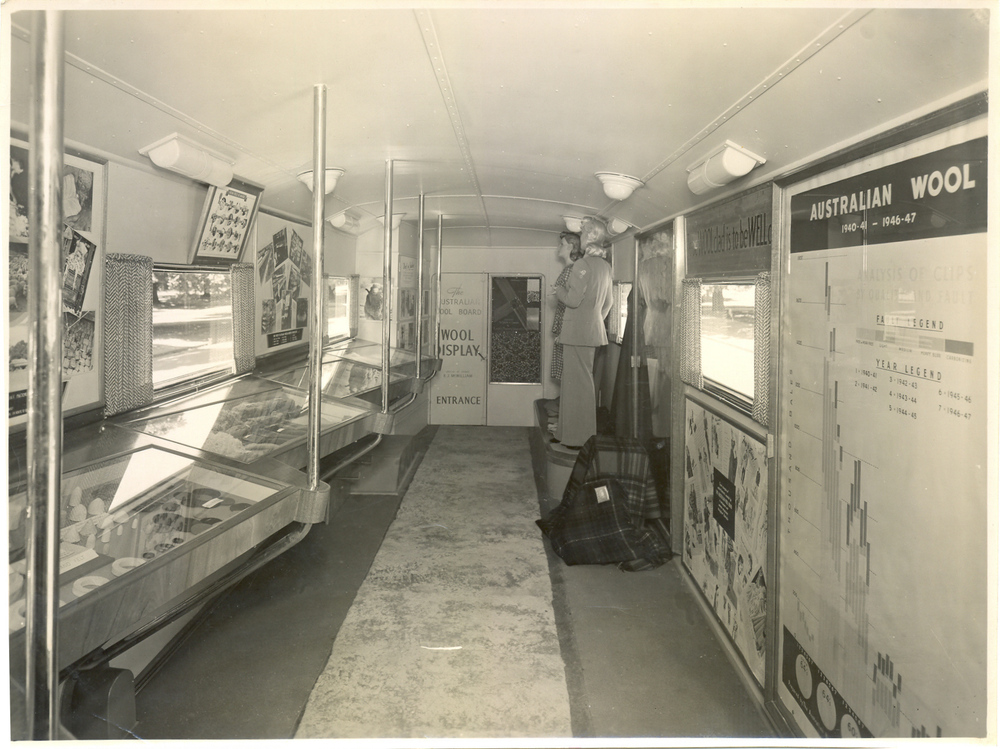 Black and white photograph of the interior of the Australian Wool Board's promotional caravan.