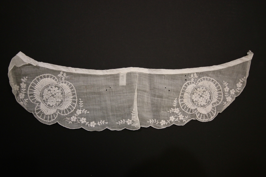 Attachable white muslin collar embroidered with small white flowers and two large floral motifs.