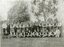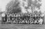 Team and club officials lined up in front of wooden picket fence with trees in background. Team manager at centre holding trophy.