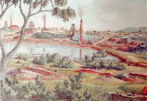 B/W North Cross Reef with buildings, poppet heads, Tailings and wood stack with people. Two colour prints of North cross Reef. One at a different angle to B/W. Second taken further back with wood stacks, tailing dam fenced in beyond poppet heads buildings chimmney's smoking.