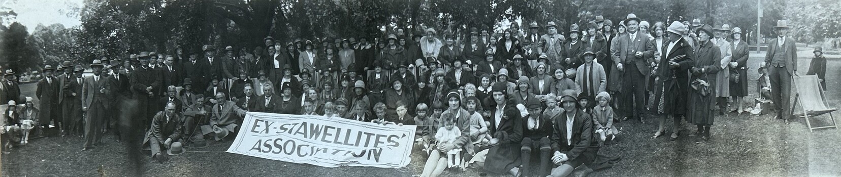 Large Group of people in Gardens. Banner prominent in picture. 1931