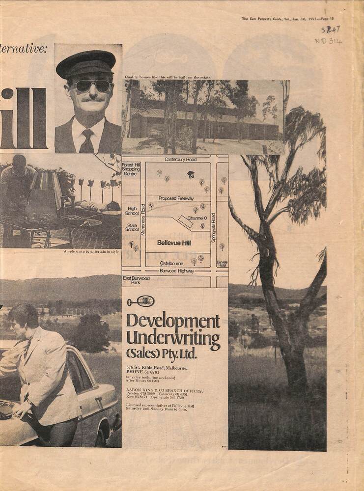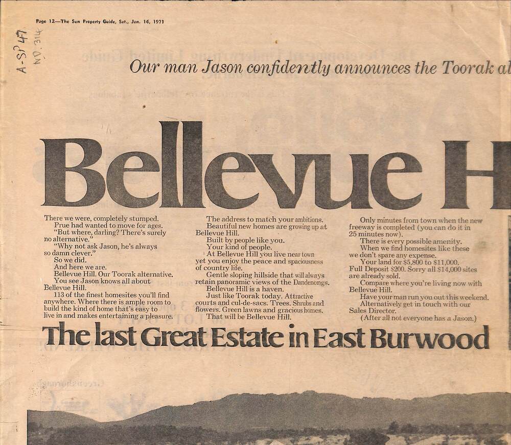Newspaper cutting advertising sale of Bellevue Hill Estate, East Burwood in 1971. Comprising 113 home sites. Estate bordered by Mahoneys Road and Springvale Road