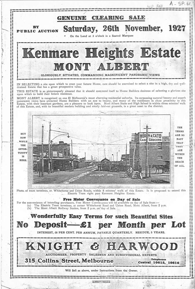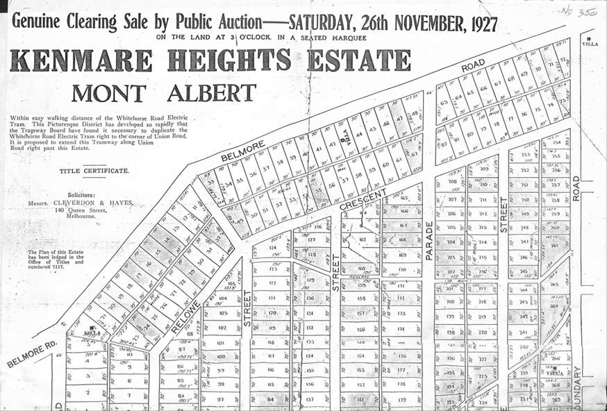 Clearing sale by public auction , Saturday 26/11/1927 of Kenmare Heights Estate Mont Albert, Situated between Belmore Road, Boundary Road, Strabane Avenue, Union Road and Dunloe Avenue. Advertising material and map