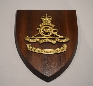 Emblem depicts Crown over cannon with banner below. The latin phrase ubique (everywhere) over " quo fas et gloria ducan " (where right and glory lead). Royal Australian Artillery on banner below.