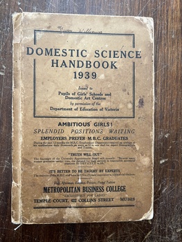 This is a book of 120 pages. It has a light brown cover with black printing and an image of a small child on the back cover. The pages contain printed material and black and white advertisements. The front cover is almost completely detached from the spine. The pages are bound with metal staples.