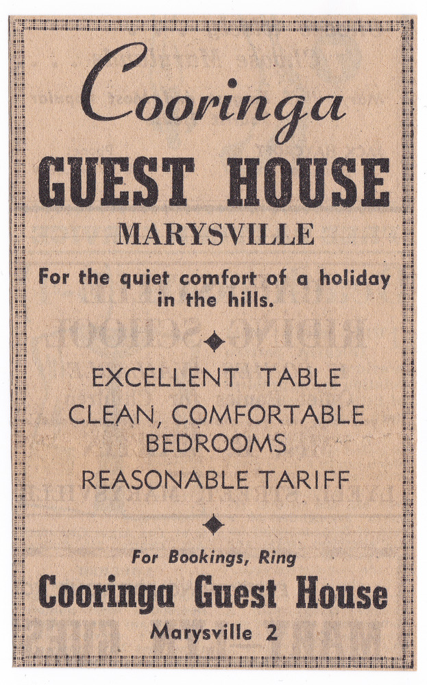 An advertisement for Kooringa Guest House in Marysville that has been cut out from a newspaper. The name Kooringa has been spelt incorrectly.