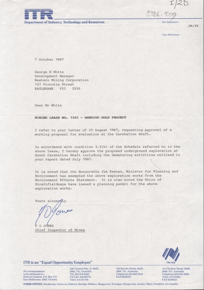 One page letter from Department of Industry, Technology and Resources to George H. White, Development Manager, Western Mining Corporation, Eaglehawk, re mining lease no. 1345, Bendigo Gold Project. Approval of a working proposal for evaluation at the Carshalton Shaft has been sought by Western Mining Corporation. The Department of Industry, Technology and Resources 'hereby approves the proposed underground exploration at South Carshalton Shaft including the dewatering activities outlined in your report dated July 1987'. The Minister for Planning, Jim Keenan, has exempted the exploration works from the Environment Effects Statement. Shire of Strathfieldsaye have issued a planning permit.