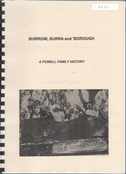 Booklet - Burrow, Burra and 'Borough - a Powell Family History, 1996 6691 C Media reuse Reuse this media Can you reuse this media without permission? Yes Conditions of use Public domain This media item is listed as being within the public domain. As such, this item may be used by anyone for any purpose. Attribution Please acknowledge the item’s source, creator and title (where known) Have a question? Contact Bendigo Historical Society Inc. Download Download image (jpeg) Physical description Spiral bound pale coloured plastic cover booklet of 82 pages'Burrow, Burra and 'Borough' a Powell Family History. B&W photo of Powell people on front cover.Compiled and edited by Pauline E Powell 1996Illustrated with B&W photos and maps Inscriptions & markings Handwritten comments made against some phots Subjects powell, family history