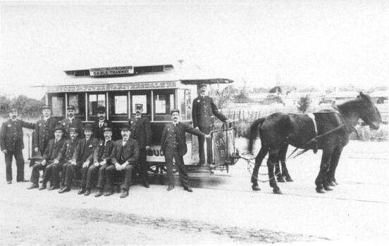 Photo shows one of the horse trams and staff that operated the line that ran from Hawthorn Bridge via Burwood Road, Power Street, and Riversdale Road to Auburn Road, opening in 1890. There are 8 uniformed men and three officers in the photograph. In the background are many undeveloped housing blocks, and the Hawthorn Town Hall tower. The tramway operated until 1916 when it was replaced by an electric tram. See item 6159 for a wider view showing a man at the rear of the tram used in the 1989 Australia Post Stamp Fair. The second copy of this photo held shows the wider view.