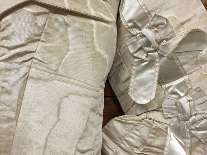 Ladies cream silk bodice with long sleeves. Deep Vshape at front neckline and drops to deep V shape at waistline. Silk double ruffle around neckline. Bodice is boned at centre front and two bones at either side of V neckline. Bones on either side of back opening. Back opening with small holes for lacing down each side. Lacing missing. Hook and eye at waist below back opening. Sleeves have 11 cm flared cuffs. Sleeves have two rows of satin ribbon and bows.