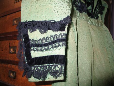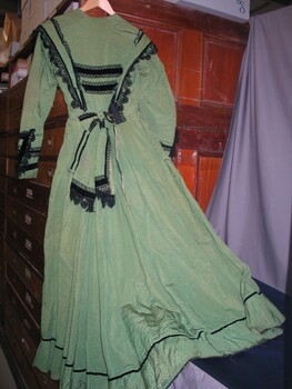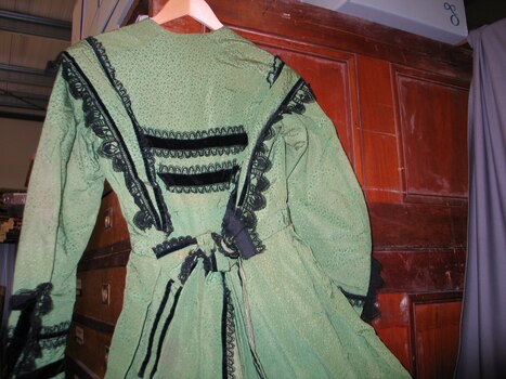 Clothing. Bright green cotton wedding dress with small lined pattern on fabric. Long sleeves. Floor length skirt.Fitted bodice with front opening with eleven hooks and eyes. Front opening on skirt with three hooks and eyes. Gathers at centre back of skirt. Large decorative bow at centre back of skirt. Sleeves and bodice have black velvet ribbon and black lace trim at back and front. Black velvet ribbon trim around hemline. Broiderie lace edge around neckline.Estate of Frieda Kahland, born 1891 died 1988 in Bendigo. Parents --Johann Detlef and Elizabeth Sarah Fly. Johann was a well known wine and cordial maker. See also records: 11400.363, 11400.364, 11400.365, 11400.366.