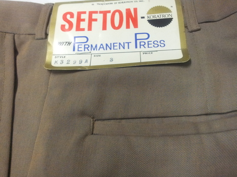 Internal Label: Seftow Producxtion for Men and Younger Men size 3, 65% polyester; 35% viscose; KORATRON Trade mark of the Koratron Company.