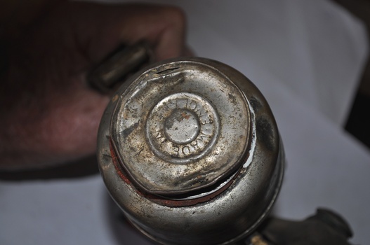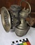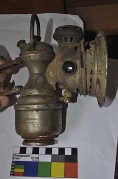 Carbide Vehicle Lamp. Silvered Metal. Left hand has a small red lens, Right hand side has a small green lens. Front lens is missing. 'Made in England is imprinted on the base. Has a Carry Handle and a Flexible mounting bracket at the rear. Approx. 120mm wide by 150mm high