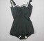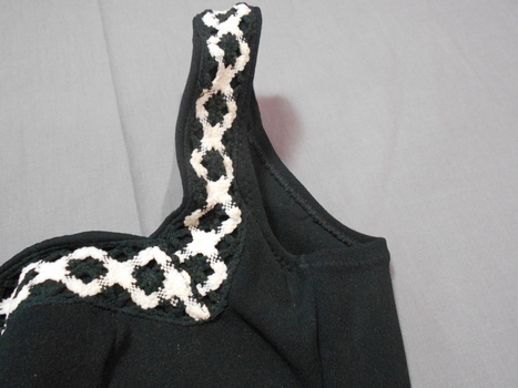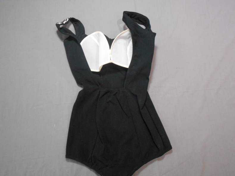 Black one piece ladies bathers with bra inserts and skirt front. Square neckline. White embroidered chain pattern around neckline and on straps over shoulders.