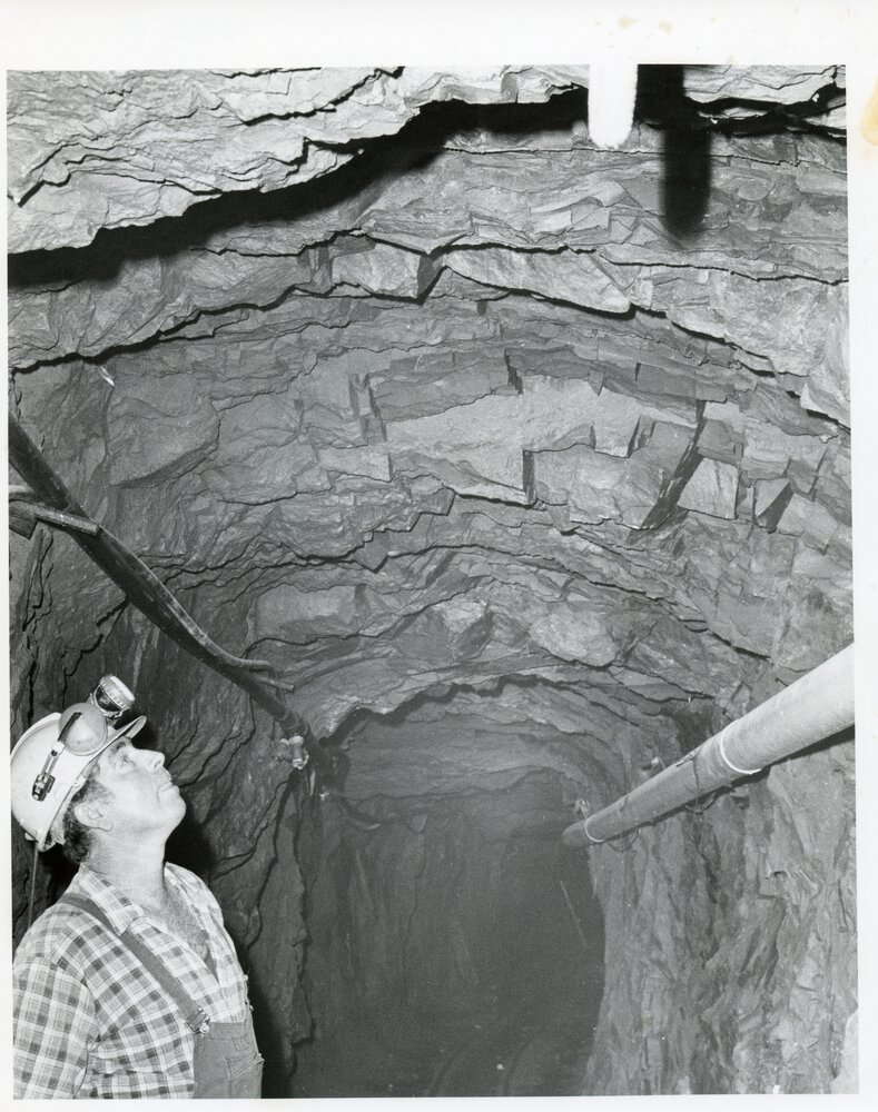 Black and white photo of miner Ray Beer, wearing hard hat and mining lamp checking mine roof at Central Deborah Mine, Bendigo.