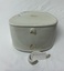 A cream porcelain slipper pan with handle, pear shaped base and black printed instructions on the inside back