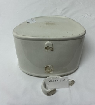 Impressed "E" and "Large" on the base. On the inside back printed " The New Slipper Bed Pan - this slipper should be passed under the patient in front between the legs. If a flannel cap is made for the blade, fastened by strings under the handle, considerable comfort will be afforded