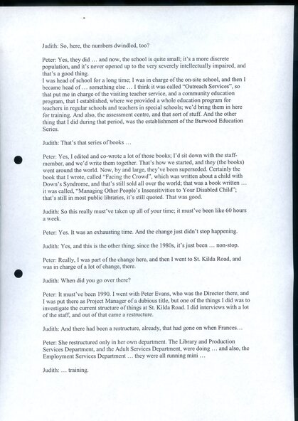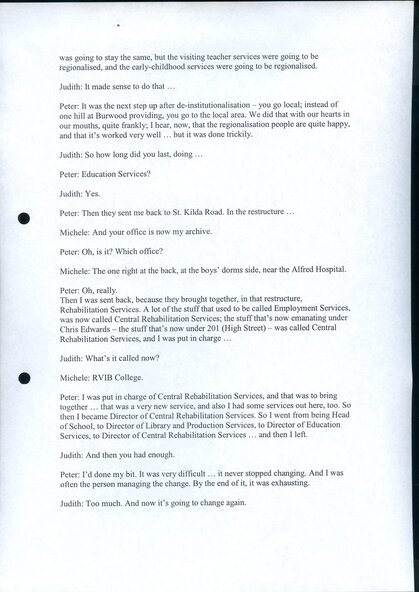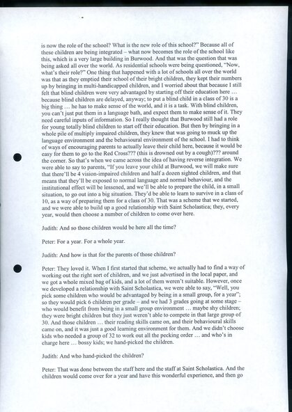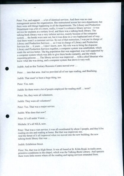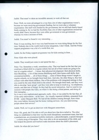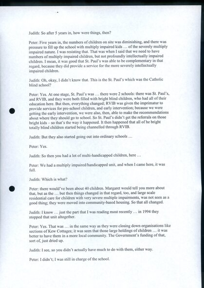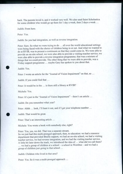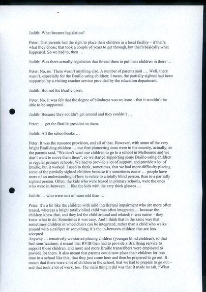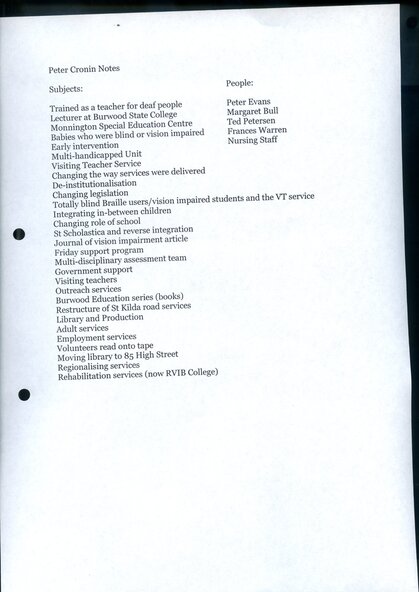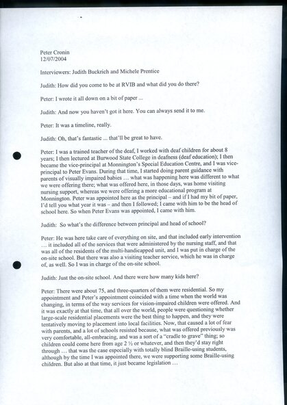 Oral history interview and partial transcript of Peter Cronin by Judith Buckrich, with Michele Prentice. Recorded as part of 'Lighthouse on the Boulevard'. Former students and staff recall their days at RVIB, the impact of what they learned and experienced there, and how the attitudes to blindness and low vision changed over the years.