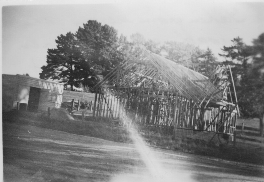 Black and white photograph of a shed and house under construction with frame and pitched roof. Light streaming across photo.