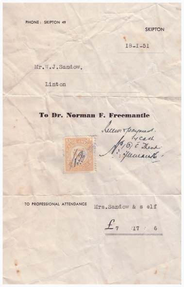 Photocopy of original account tendered for medical services provided to Mr. W. J. Sandow of Linton, by Dr Norman F. Freemantle, of Skipton. The account is for "Professional Attendance, Mrs. Sandow and self", it is dated 18-1-51 and the amount invoiced is seven pounds, seventeen shillings and sixpence. The account is marked "Received payment by cash, with thanks", and is signed N. Freemantle. A Victorian Stamp Duty stamp is attached, it has been initialed and date stamped.