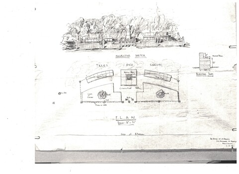 Original plan and "perspective sketch" for the Linton pioneer memorial and garden, drawn up in 1941. Coloured pencil and ink drawings on a sheet of parchment. Scale: 1/4 inch : 1 foot. Dated 7.2.41.