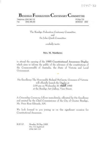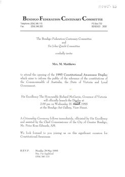 1. Invitation to Michele Matthews to the opening of the Victorian Constitutional Exhibition and Citizenship Ceremony by His excellency The Hon. Richard McGarvie, at the bendigo Art Gallery 31 May 1995.