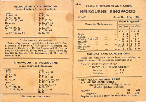 Bi-fold card for the Victorian Railways detailing time-tables and fares for the Melbourne-Ringwood line as at 10th May, 1953