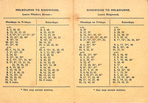 Buff coloured card printed on one side with timetables for Flinders St to Ringwood trains, and on the reverse with Ringwood to Flinders St Trains including weekends.