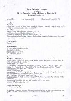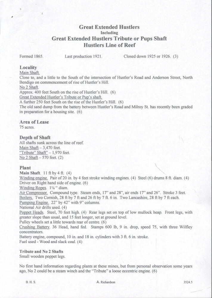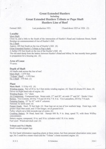 Three page typed document from original written by Albert Richardson. First page: Great Extended Hustler's including. Great Extended Hustlers Tribute of Pups Shaft, Hustler's line of reef. Mine formed in 1865, closed down 1925 or 1926. Locality, area of lease, depth of shaft, plant , early history, prominent and leading mines and best gold obtained from the mines is discussed. Poppet heads of the Great Extended Hustlers to the Stanfield mine at Long Gully and then to the Wattle Gully mine at Chewton.