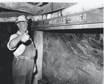 Black and white photograph. Ray Beer, underground at Central Deborah Gold Mine, standing alongside wooden sign 'Murrell's Corner'. Sign is placed horizontally on timber supports, side of drive visible in background. Ray is wearing bib and brace overalls and hard hat with a belt around his waist. He is giving a 'thumbs up' sign.