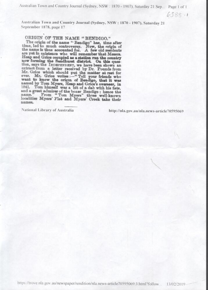 One page photocopy of newspaper article 'Australian Town and Country Journal (Sydney 1870 - 1907) Saturday 21st September, 1878, page 17: article headline ' Origin of the name Bendigo', regarding a letter from Mr. Grice stating that Bendigo was named by Tom Myers, Heap and Grice's overseer.