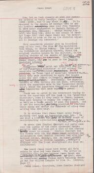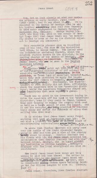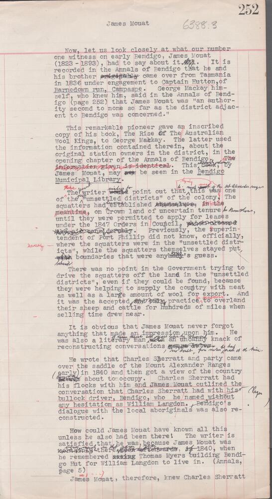 Two foolscap typed pages recounting James Mouat's recollections of how Bendigo was named. Pages have been taken from a lined journal. On top right hand corner of pages, '252' and '250', respectively. Typed recount has black and red pen alterations. On top of page '252' is typed 'James Mouat'.