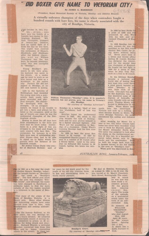 Article regarding William Thompson ' Did Boxer Give Name to Victorian City?' by James G. Harrison, President Royal Historical Society of Victoria, Bendigo and District Branch, on page 28 and 29, details Thompson's boxing story and allegedly, how his fighting name came to be the name of the city of Bendigo. The text is annotated in dark blue biro, refuting some of the claims made in it regarding the early days on the field, and particularly in relation to Tom Myers.