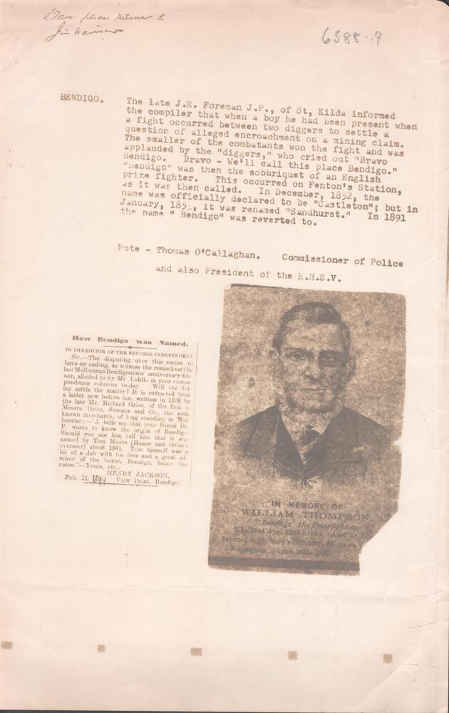 Photocopy, on parchment coloured paper, of two articles regarding how Bendigo was named. Top on page, underneath article: 'Note, refers to Thomas O'Callaghan, Commissioner of Police and also President of the RHSV'. Bottom article, a copy of a letter written to the Bendigo Advertiser by Henry Jackson, View Point, Bendigo on February 21st. 1899, titled 'How Bendigo was Named'.