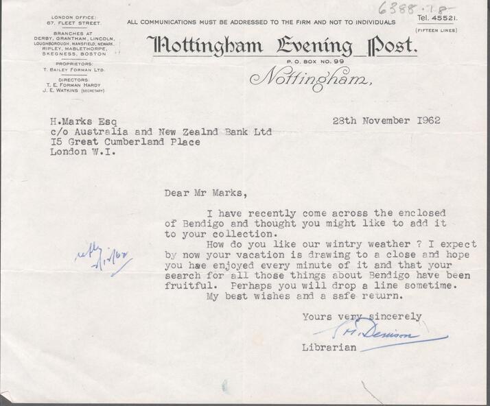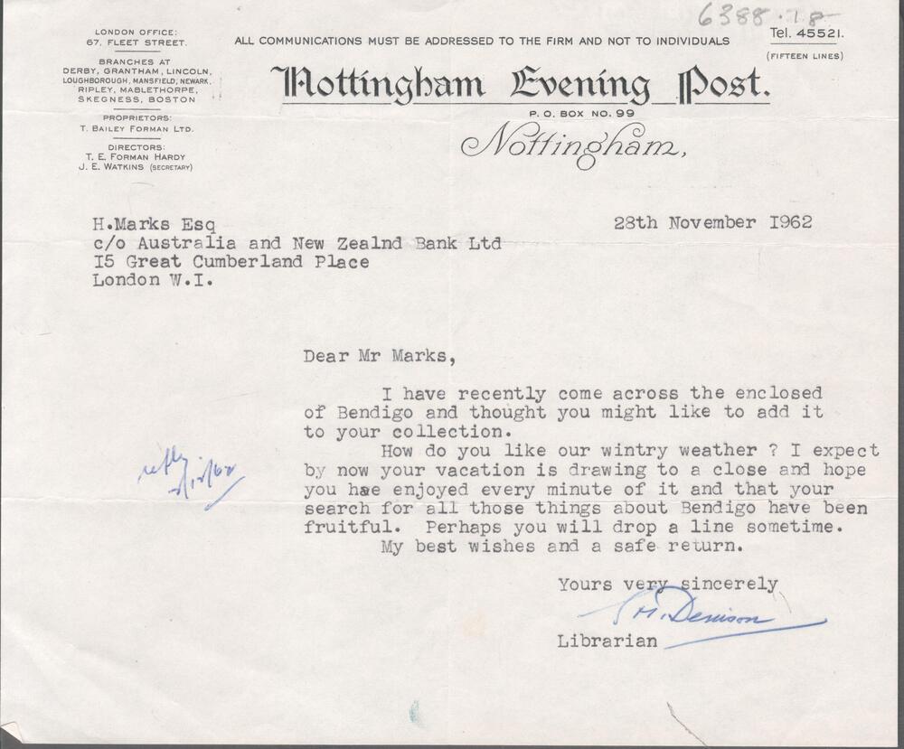 One page letter from Nottingham Evening Post, Nottingham, to H. Marks, c/- Australia and New Zealand Bank Ltd., 15 Great Cumberland Place, London., 28th November, 1962, re 'enclosed of Bendigo' (presumably print of Bendigo, the racehorse) from Denison, Librarian.