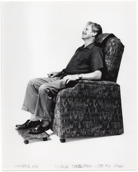 B&W photo of a man sitting in an lounge chair, smiling. The armchair has a padded headrest and armrests. On the floor in front of the armchair is a matching low footstool with four castor wheels. Written at the bottom of the photo is the text, "ARTISTIC AD REVERSE DIRECTION LEFT TO RIGHT”.