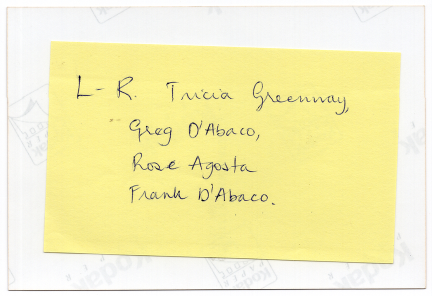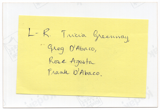 [On a yellow sticky note, handwritten in blue ink] L-R. Tricia Greenway, Greg D'Abaco, Rose Agosta Frank D'Abaco.