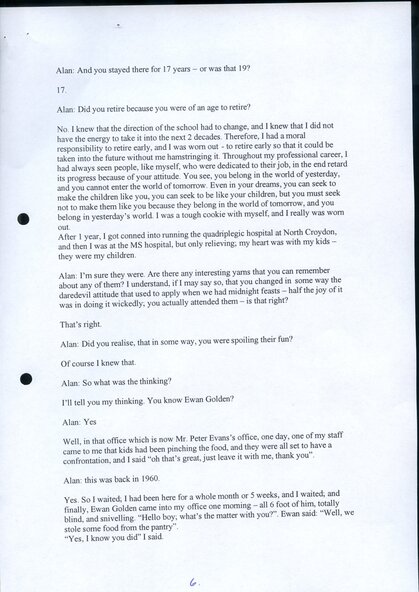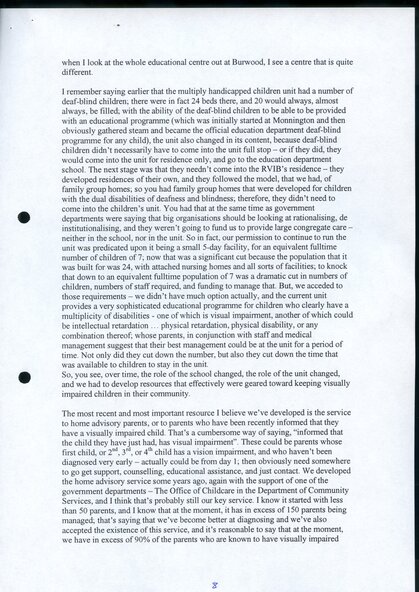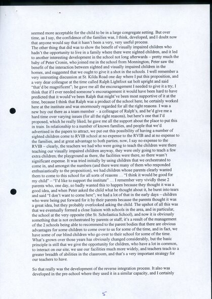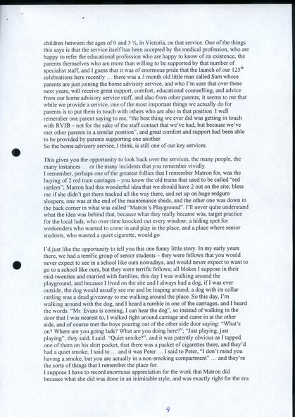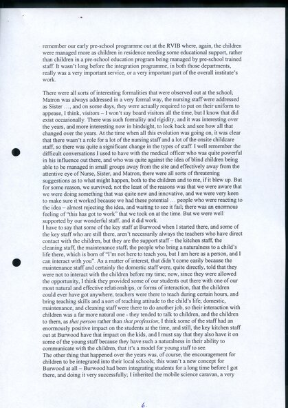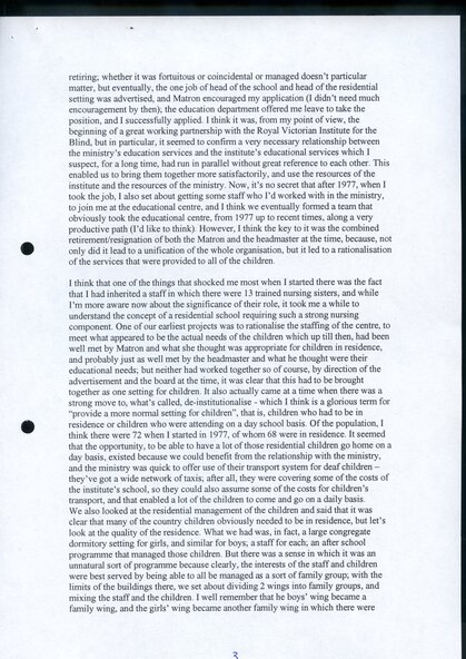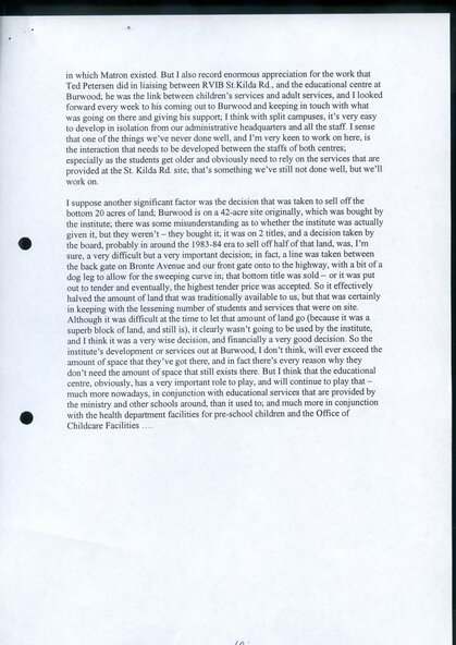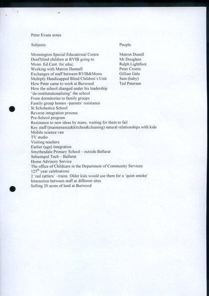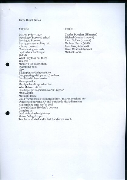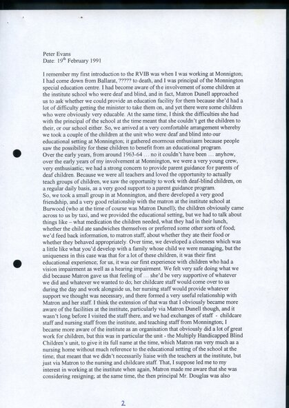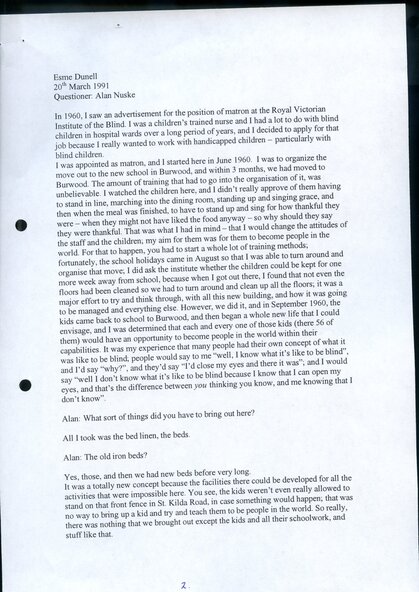 Oral history interview of Esme Dunnell and Hugh Peter Evans by Alan Nuske. Recorded as part of 'The Years Between: an oral history of the RVIB 1866-1991'. Former students and staff recall their days at RVIB, the impact of what they learned and experienced there, and how the attitudes to blindness and low vision changed over the years.