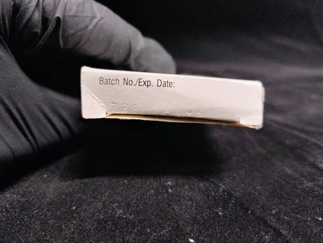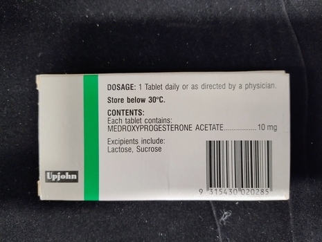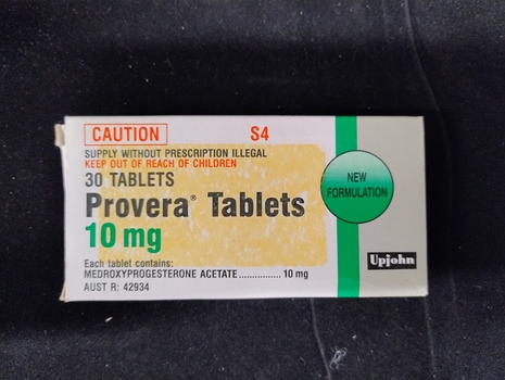 Box containing two strips of Provera tablets and instruction booklet. Text printed on front of box reads '30 TABLETS/Provera (R) Tablets/10mg/Each tablet contains:/MEDROXYPROGESTERONE ACETATE 10 mg'. Front of box also printed with warnings, logo of manufacturer - Upjohn - and a graphic describing it as 'NEW/FORMULATION'. Back of box printed with dosage and storage instructions, ingredients, and Upjohn logo. one end of box imprinted with batch number and expiry date - expiry date is 'JAN 95'.