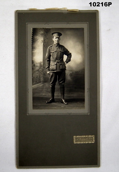 Portrait black and white picture of an Australian soldier in a pose position at a studio. Picture stuck onto a grey edged piece of cardboard. Soldier has Sergeant's stripes and photo taken in Castlemaine.