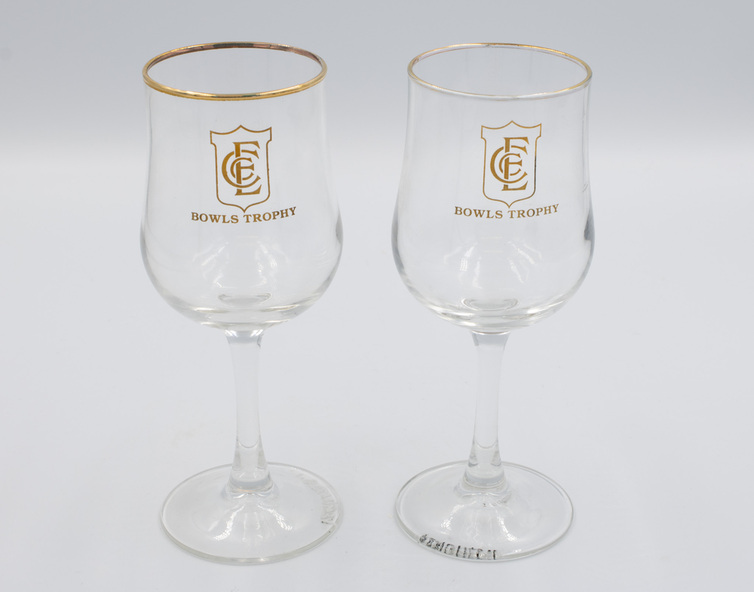 Two wine glasses awarded as prizes by the Emerald Country Club.
