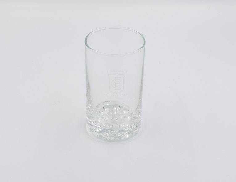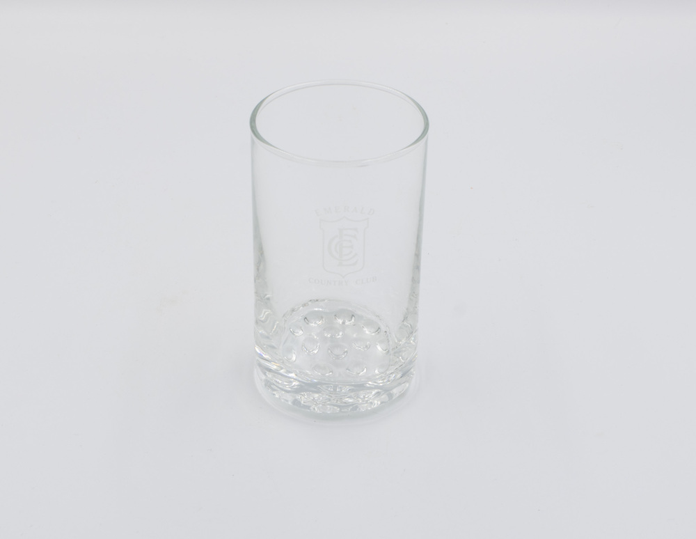 One tall, plain drinking glass with 'bubble' base and Emerald Country Club logo on the side.
