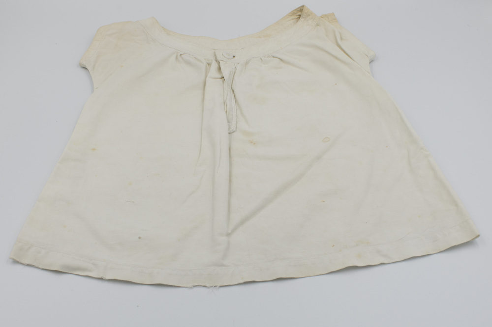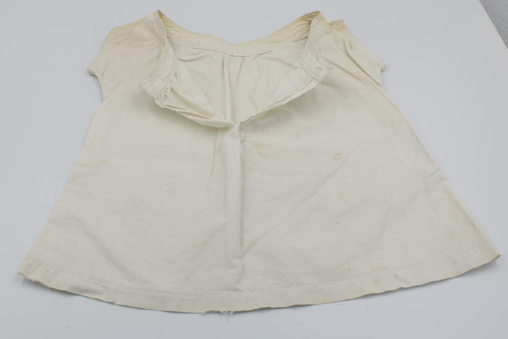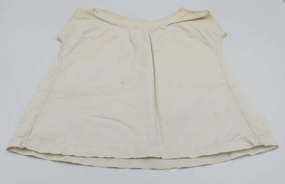 White sleeveless cotton bodice with a one-button opening at the neck. Neckline and front opening are finished with double rows of top stitching. Arm openings finished with single lines of top stitching.