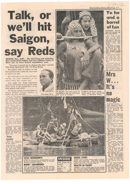 On page three (3) of the Sun newspaper dated Monday April 21, 1975 appears an article in large black print with the heading " Talk, or we'll hit Saigon, say Reds". It shows the photo (head shot) of the former President of South Vietnam President Thieu.