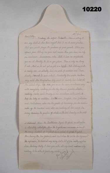 White paper letter written in pencil from an Australian POW in Austria to his wife in Australia. Folds up in 4 pages into an envelope. On the front is some phrases in German. On one folded section is name and address of the receiver and on another is name and number of sender. Both of these pages have a sticker saying "3 opened by censor". At the top of page is a fold that inserts into a slit on page 3 to fold a nice envelope.
