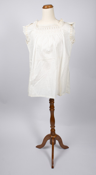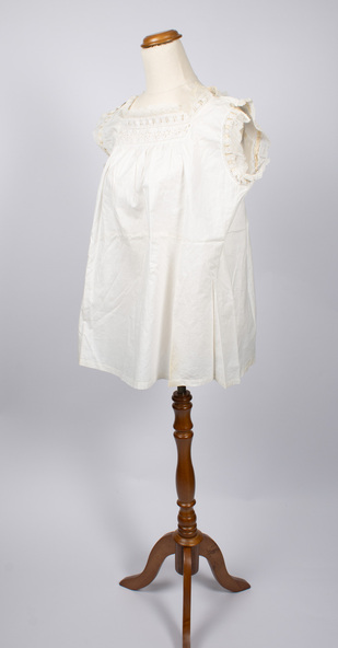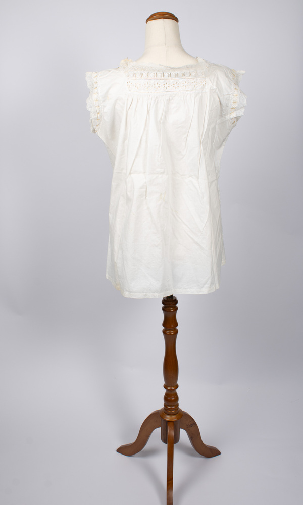 Hand sewn, sleeveless fine woven cotton, loose-fitting garment detailed with deep cream coloured ribbon lace on armholes. The neckline is square-shaped and has a broad band of ribbon filled beneath lace detailing. The garment has 2 pearl coloured buttons on-top of the shoulders as openings.